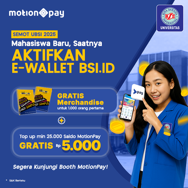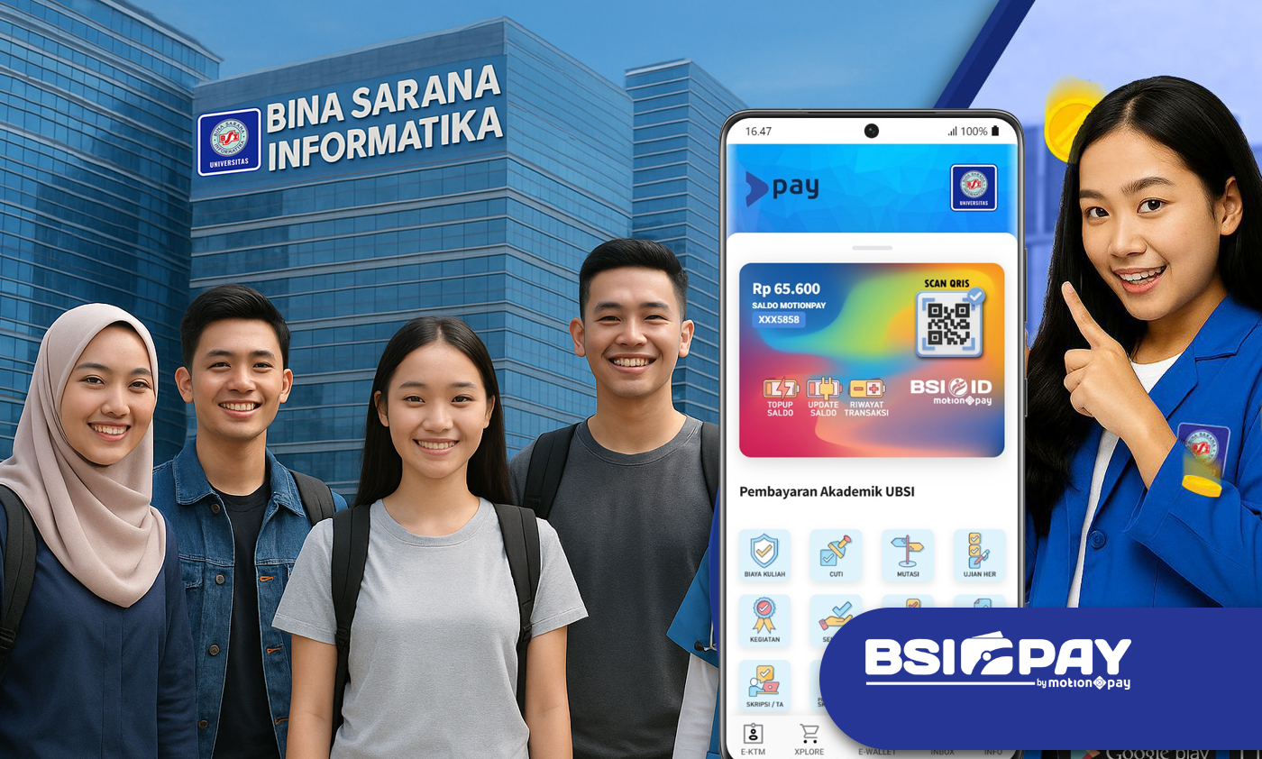 BSI PAY dipersembahkan khusus untuk civitas akademika Universitas Bina Sarana Informatika (Mahasiswa, Alumi dan Staff & Karyawan) dalam bertransaksi secara digital. Untuk melakukan pembayaran-pembayaran Akademik dan digital konten lainnya.